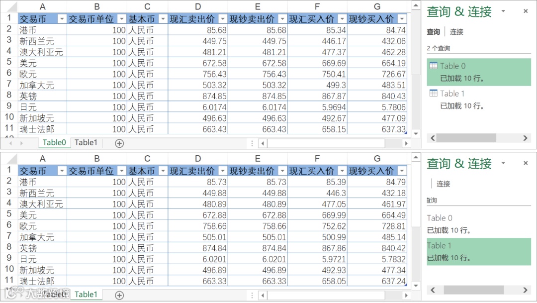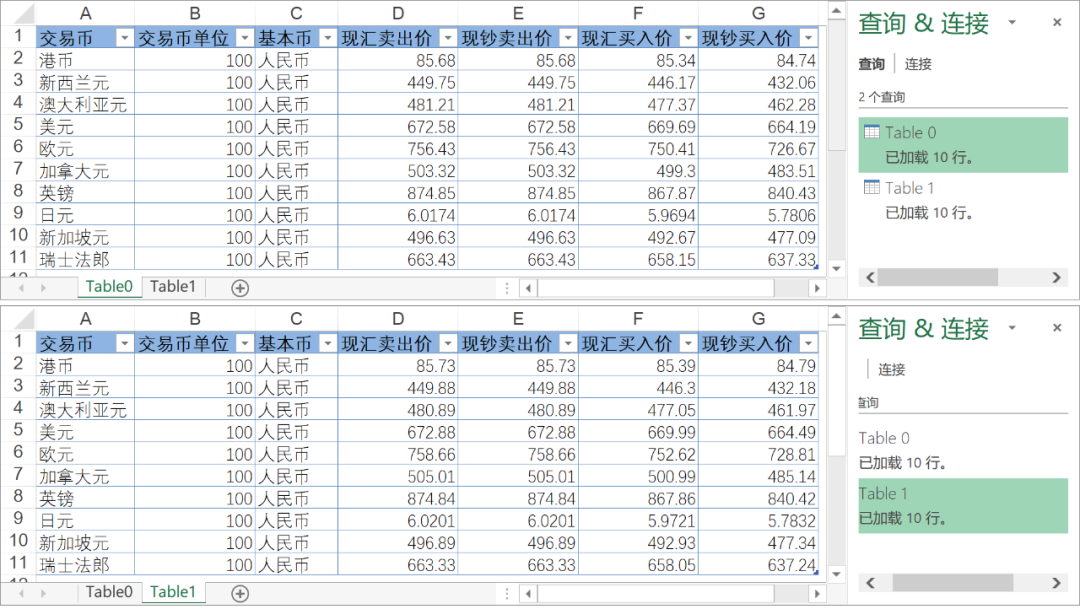 Excel 将 htm 文件中两个表格中的数据导入新建工作表中,两个工作表的名称分别为“Table0”和“Table1”,如图 2-91 所示。