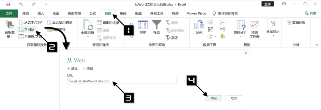 在 Excel 中单击【数据】选项卡的【自网站】按钮,在弹出的【从 Web】对话框的【URL】文本框中输入“fifile:\\C:\Data\WordData.htm”,单击【确定】按钮关闭【从 Web】对话框,如图 2-89 所示。