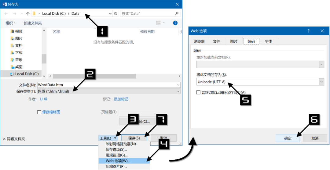 在【另存为】对话框中依次单击【工具】下拉按钮→【Web 选项】命令,弹出的【Web 选项】对话框,在【将此文件另存为】下拉列表中选择【Unicode (UTF-8)】作为文件编码格式,单击【确定】按钮关闭【Web选项】对话框。