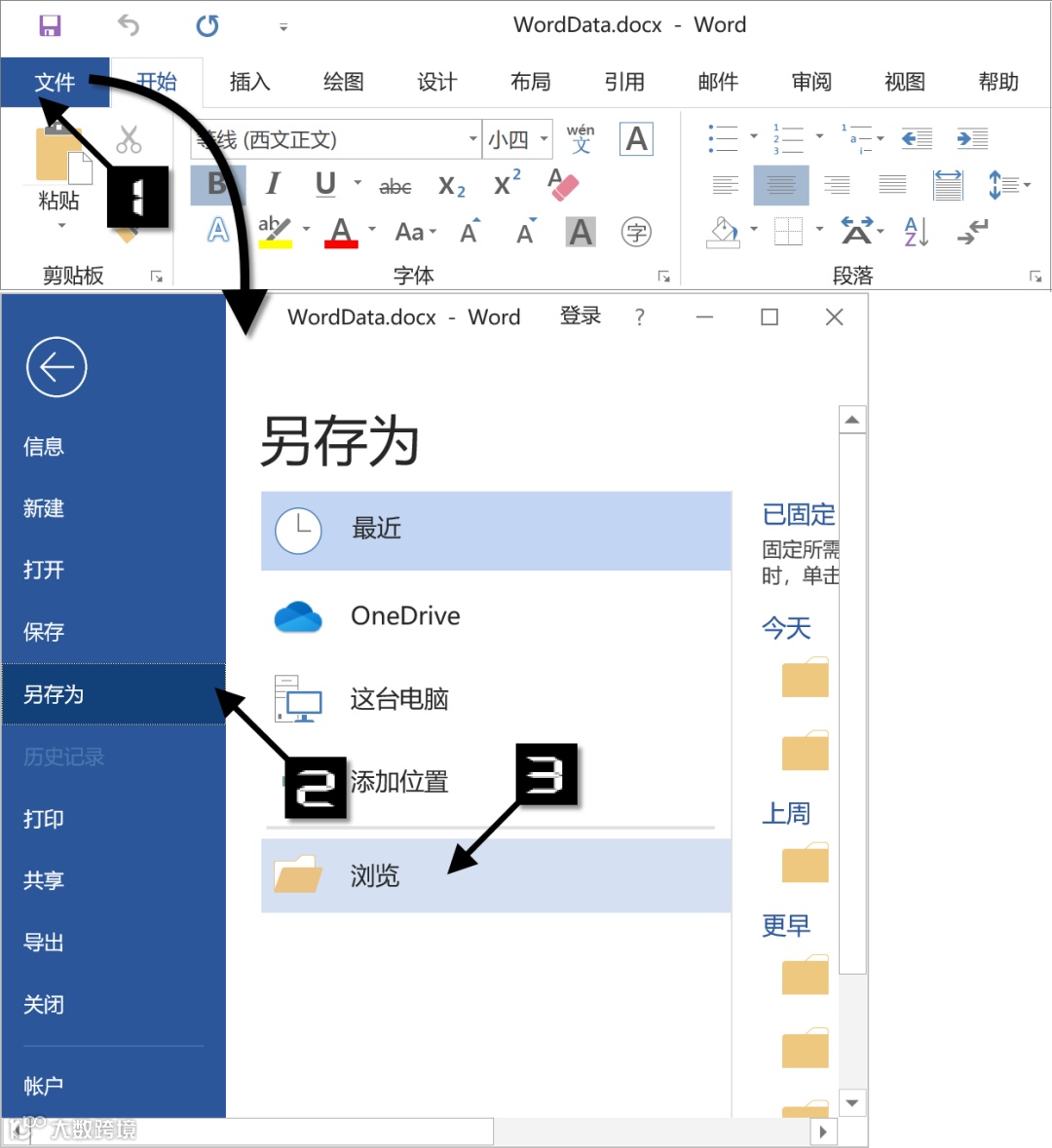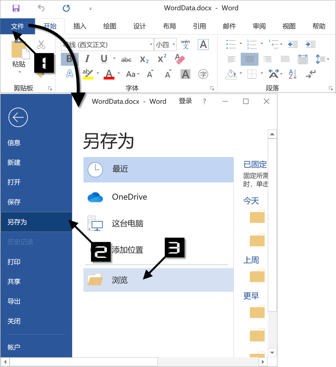 打开示例文件“WordData.docx”, 在Word中依次单击【文件】选项卡→【另存为】→【浏览】命令,如图2-87所示。