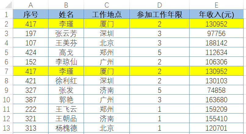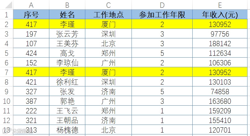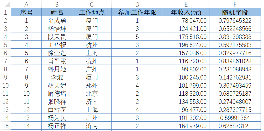 步骤1:在F1单元格输入标题:随机字段。在F2单元格输入公式=RAND(),并向下复制填充。