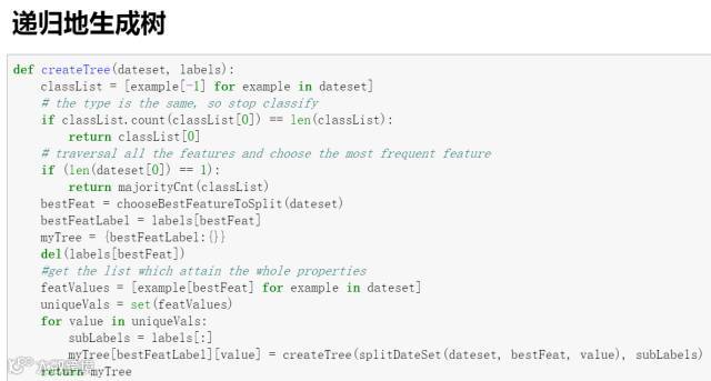 开始构建根节点,将所有的训练数据集都放在根节点,选择一个最有特征,按照这一特征将训练数据集分割成子集,使得各个子集有一个在当前条件下获得最好的分类。如果这些子集已经能够被基本正确分类,那么构建叶节点,并将这些子集分到对应的叶节点中去;如果还有子集不能够被基本正确分类,那么就对这些子集新的选择最优特征,继续对其进行分割,构建相应的结点。如此递归下去,直到所有的训练数据子集被基本正确分类,或者没有合适的特征为止。最后每个子集都被分到叶节点上,即都有了明确的分类,这就生成了一颗决策树。