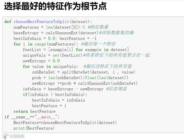 根据信息信息增益选择特征的方法是:对训练数据集(或子集)D,计算其每个特征的信息增益,并比较他们的大小,选择信息增益最大的特征。