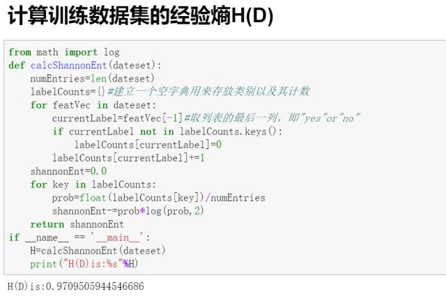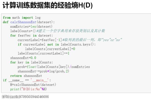 计算特征A对数据集D的经验条件熵H(D|A),这里的条件熵H(D|A)=∑pi H(D|A=Ai)=∑pi H(Di)=∑pi ∑p(Dik)log(p(Dik)),(Di中的i表示根据特征A将样本D分成i个类别,k表示样本D本身按照结果分成k个类别,比如前面的对一个工作好坏进行评定,根据工作内容好坏对样本进行分类,得到的类别数就是k;在拿特征A-工资待遇对样本进行分类得到样本类别数i),p(Dik)表示Di类别中类别k出现的概率,求取方法与朴素贝叶斯中对概率的求取方法一致,用似然估计,即用事件出现的频数的比值来代替概率。