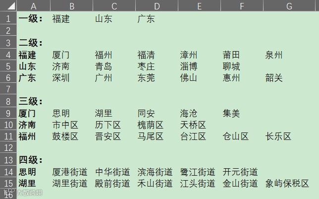 除了第1行外,第1列是父层名称,同行为父层下的子层的数据。比如A4是福建,同行(第4行)则是福建省的部分市的名称。A9是厦门,同行(第9行)则为厦门市各区县的名字。