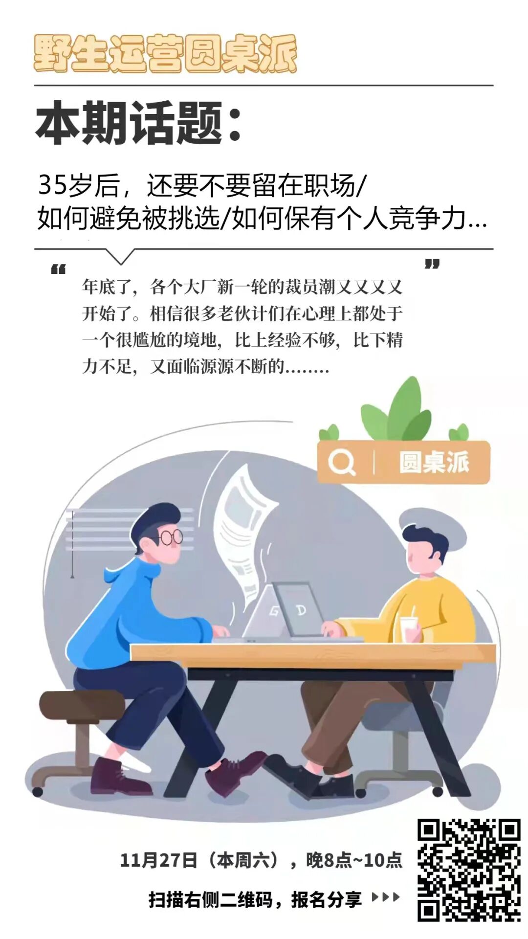 扫码报名↓↓↓与野生运营小伙伴及松月一起聊聊,你如何看待大龄职场人现状,及你为了应对这个即将到来的问题,做了哪些努力?(报名截止今晚20点)