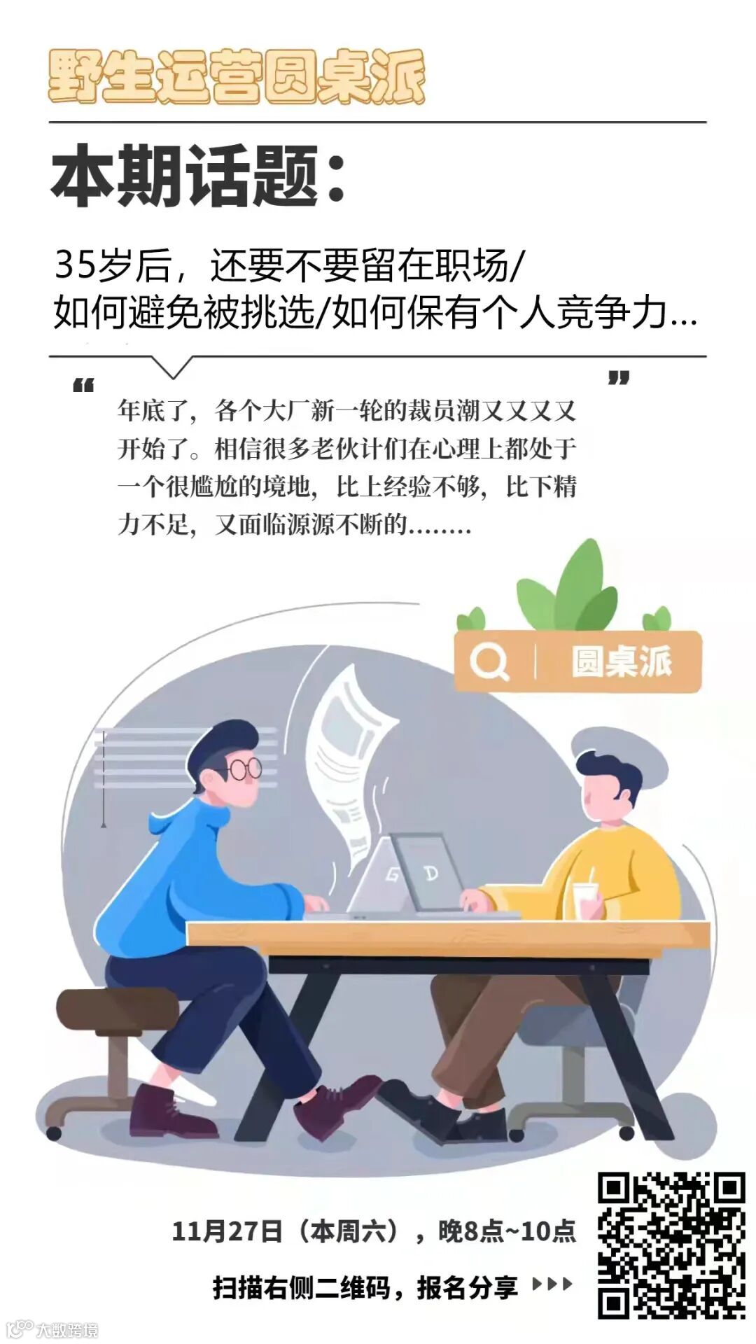 如果你也关心这个话题,那本次野生运营圆桌会议,那你一定不能错过,我们将和大家一起讨论最真实版本的互联网职场大龄员工的现实处境!一起来解决目前大龄职场人所面对的问题~一起打破互联网职场35岁的桎梏,走向更高更远的目标!