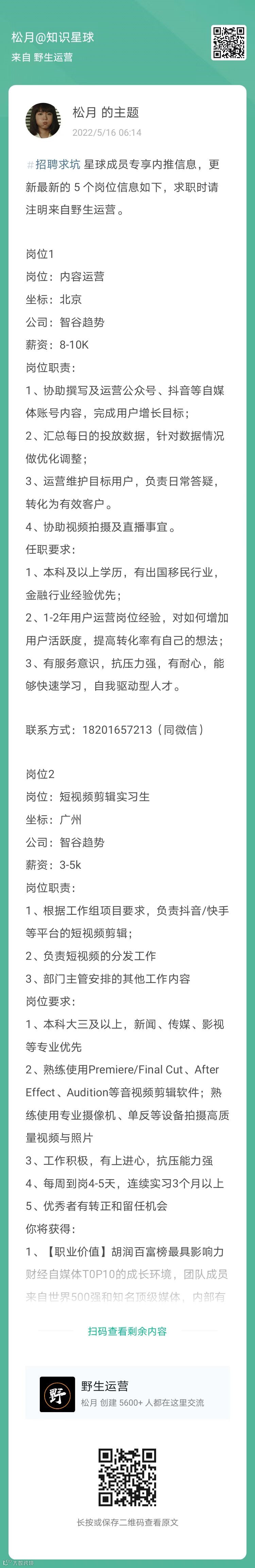 上周更新了 5 个岗位信息如下,求职时请注明来自野生运营,扫码申请岗位👇
