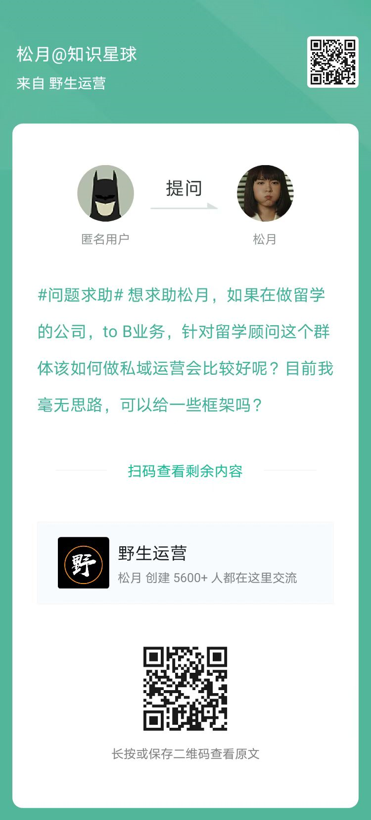 1、提问:如果在做留学的公司,to B业务,针对留学顾问这个群体该如何做私域运营会比较好呢?(扫码看全文)