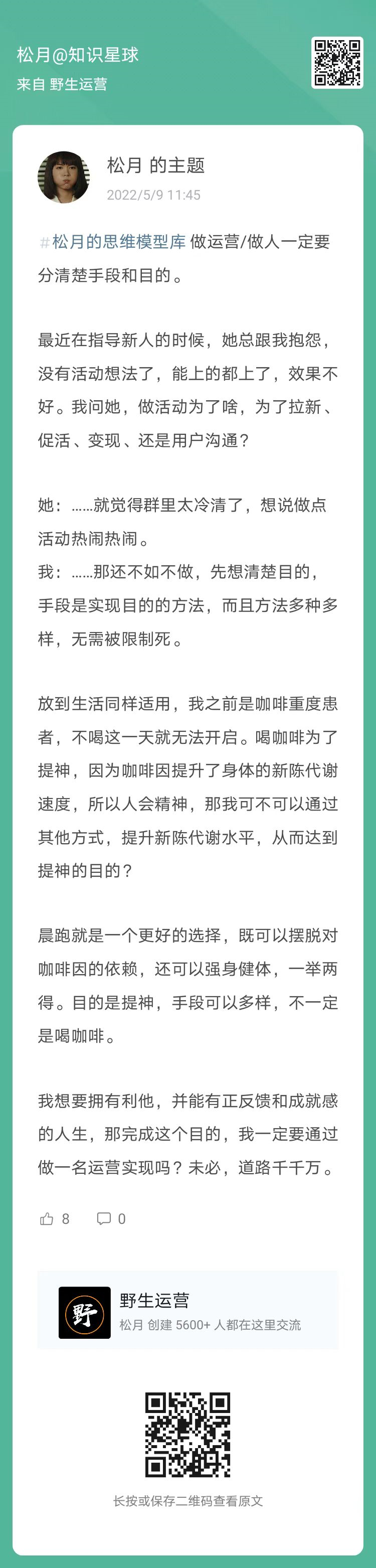 1、松月:做运营/做人一定要分清楚手段和目的(扫码看全文)