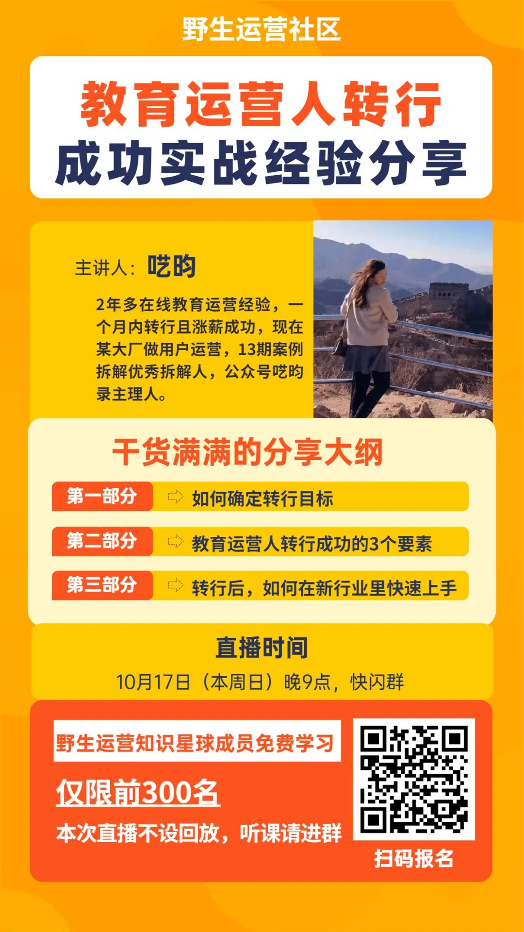 明晚9点,我邀请呓昀,一个月内转行且涨薪成功,现在某大厂做用户运营,带来分享《教育运营人转行成功实战经验分享》。本次分享不设回放,报名截止明晚8点。如果你觉得本次课程有价值,欢迎把海报分享给更多有需要的小伙伴哦,感谢❤