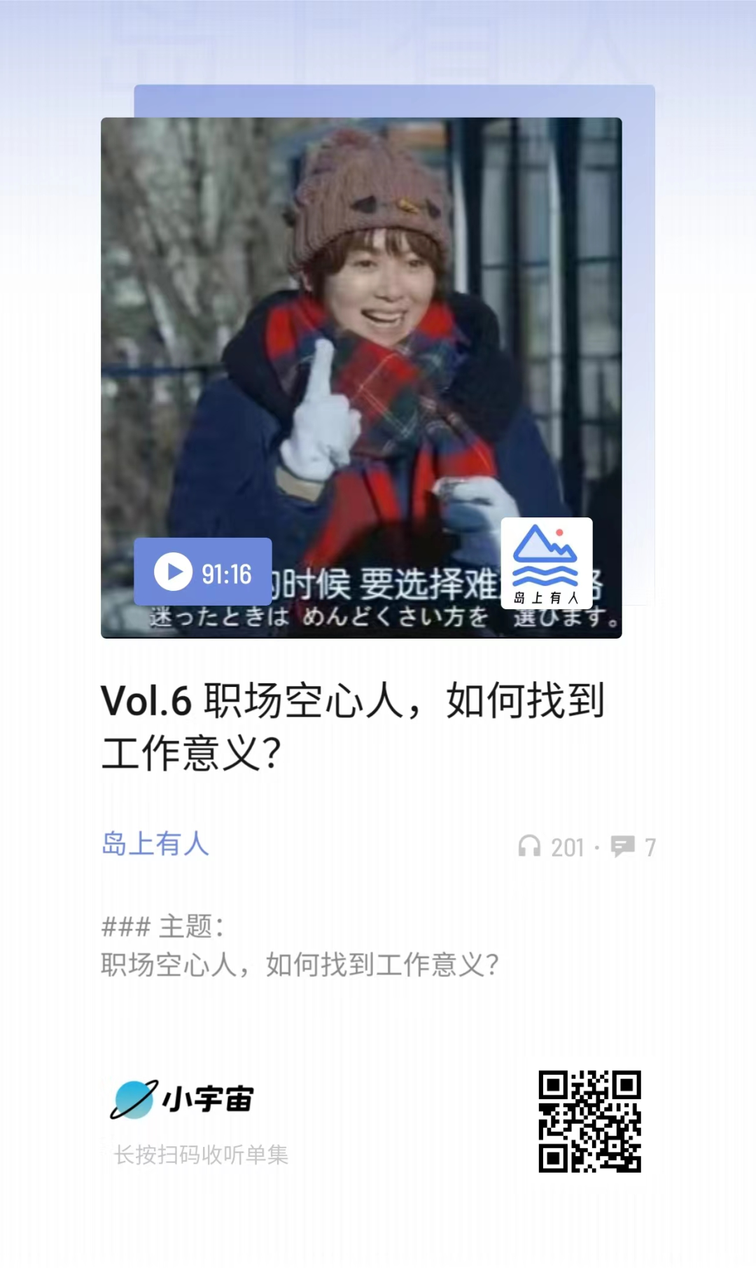 今天是周末,让自己放松一下吧,来听听《岛上有人》新一期播客:《职场空心人,如何找到工作意义》: