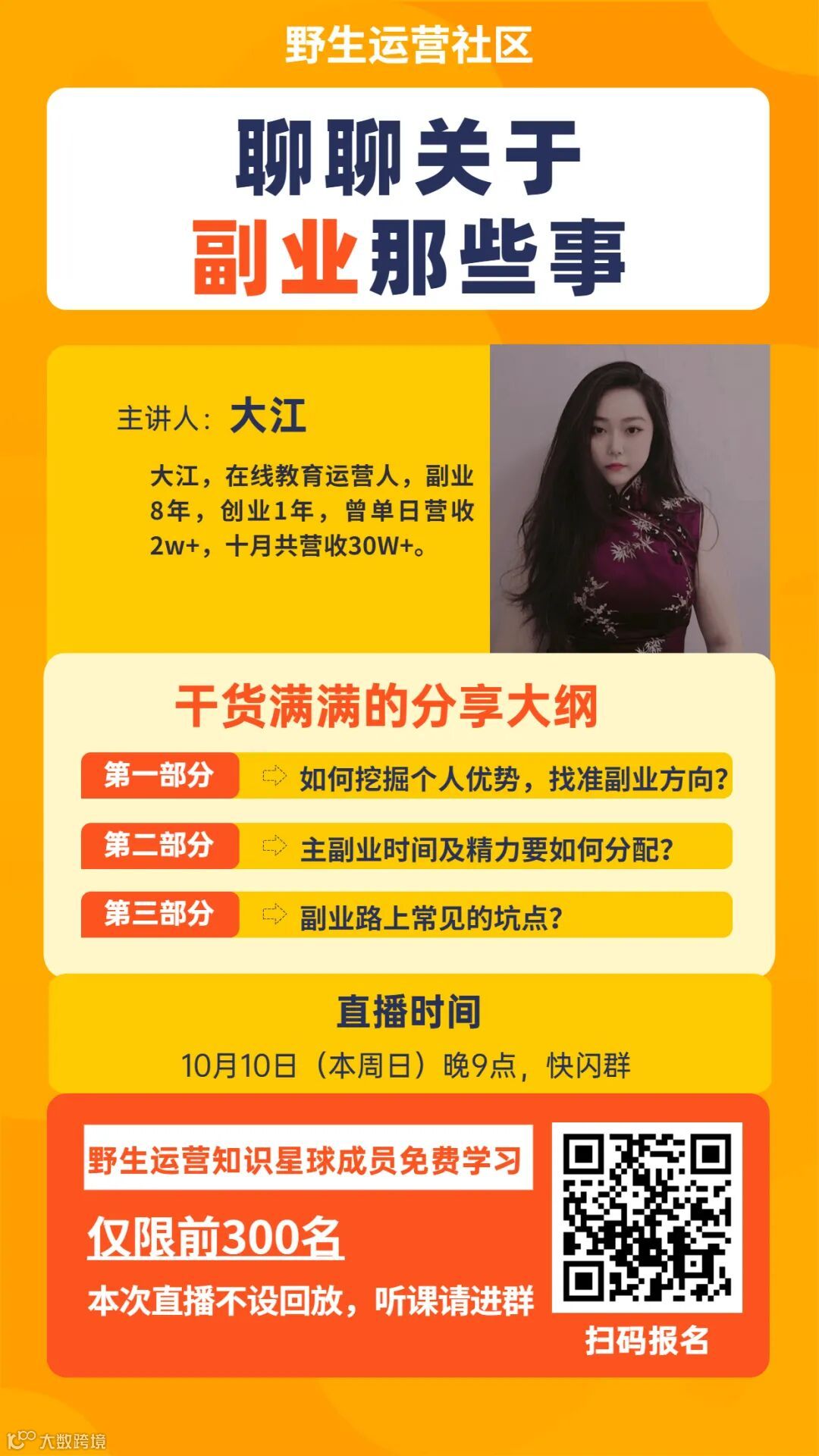 明晚9点,我邀请大江,在线教育运营人,副业8年,创业1年,曾单日营收2w+,十月共营收30W+,带来分享《关于副业的那些事》。本次分享不设回放,报名截止明晚8点。如果你觉得本次课程有价值,欢迎把海报分享给更多有需要的小伙伴哦,感谢❤