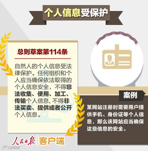 为了应对越来越突出的个人信息安全问题,民法总则草案专门规定,自然人的个人信息受法律保护。任何组织和个人不得非法收集、使用、加工、传输个人信息,不得非法买卖、提供或者公开个人信息。