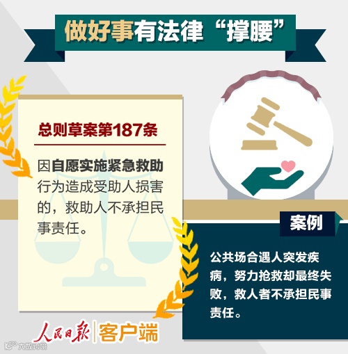 同时草案还规定,因保护他人民事权益而使自己受到损害的,由侵权人承担民事责任,受益人可以给予适当补偿。没有侵权人、侵权人逃逸或者无力承担民事责任,受害人请求补偿的,受益人应当给予适当补偿。