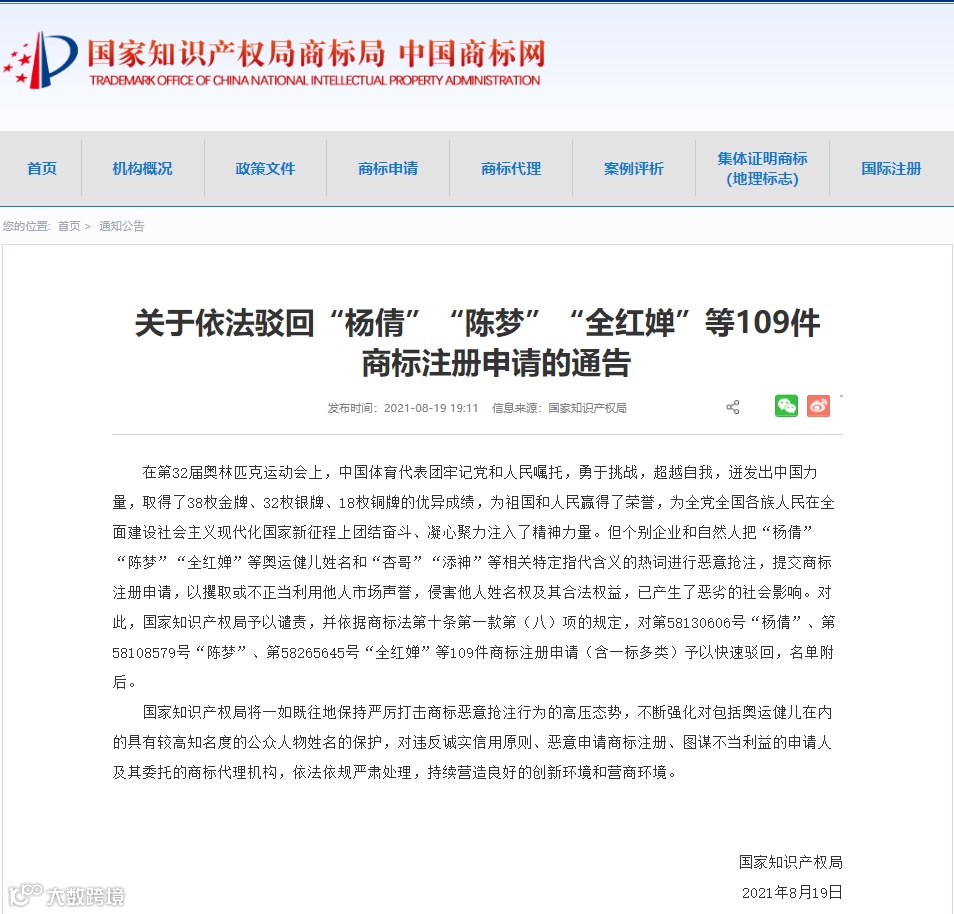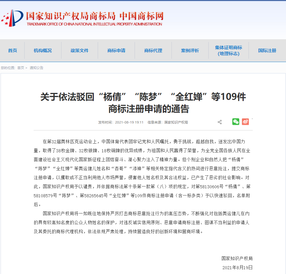 关于依法驳回“杨倩”“陈梦”“全红婵”等109件商标注册申请的通告