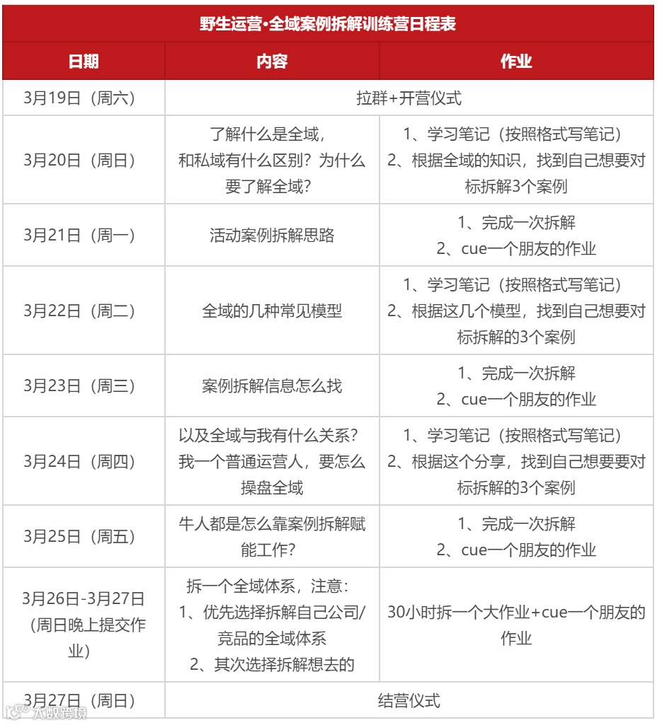 还是回到野生运营所倡导的:最高效的学习方式就是学习别人的成功经验,并举一反三复用在自己身上,从而少踩一些没必要的坑。2022年初始,野生运营案例拆解训练营再次升级,升级为“全域案例拆解训练营”,从公域到私域,从全局到细节,让你看到运营跨平台、跨用户生命周期的全实操过程。具体活动要怎么参与,感兴趣的小伙伴,请继续看下去吧!