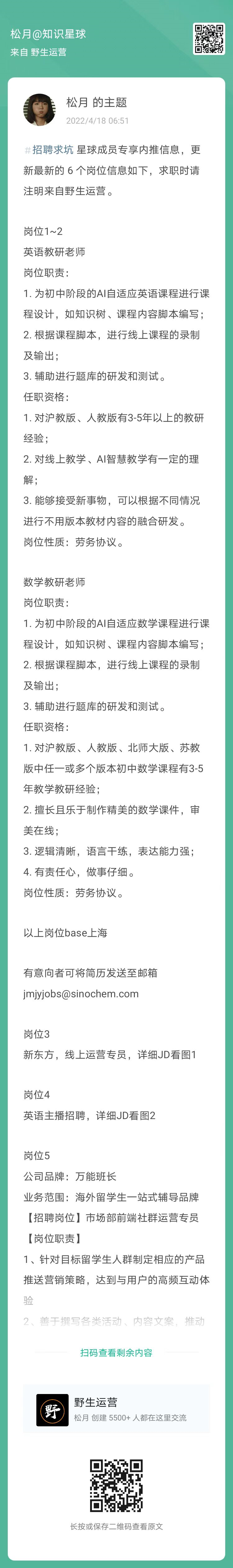 上周更新了 6 个岗位信息如下,求职时请注明来自野生运营,扫码申请岗位👇