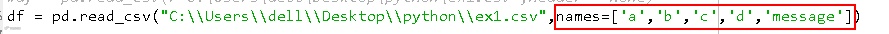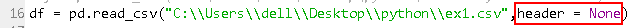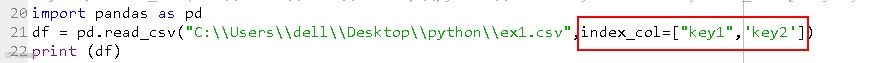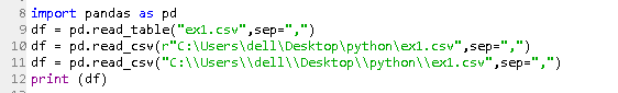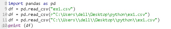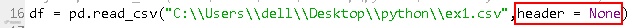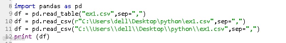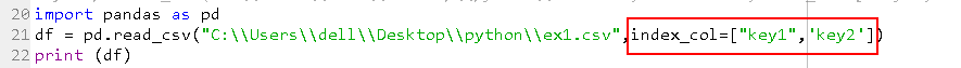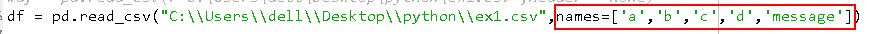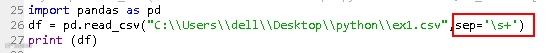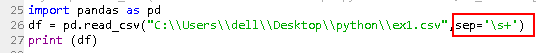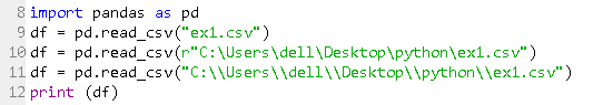 特殊说明:第9行使用的条件是运行文件.py需要与目标文件CSV在一个文件夹中的时候可以只写文件名。第10和11行中文件名ex1.CSV前面的部分均为文件的路径。