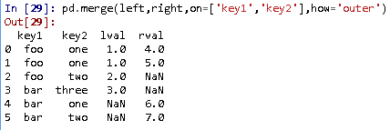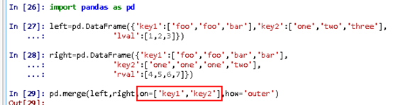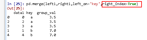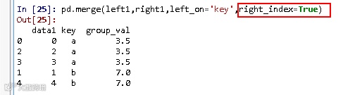 上面两个用于DataFrame中的连接键位于其索引中,可以使用Left_index=True或right_index=True或两个同时使用来进行键的连接。