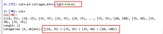 默认情况下,cut对分组条件的左边是开着的状态,右边是闭合状态。可以用left(right)=False来设置哪边是闭合的。