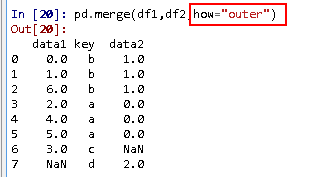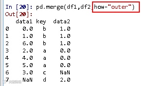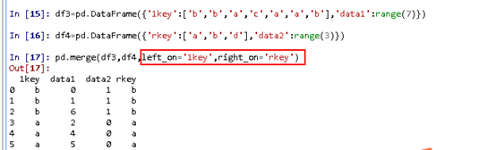 通过上面的语句得到的结果里面只有a和b对应的数据,c和d以及与之相关的数据被消去,这是因为默认情况下,merge做的是‘inner’连接,即sql中的内连接,取得两个对象的交集。也有其他方式连接:left、right、outer。用“how”来指明。