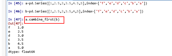 对于重复的数据显示出相同的数据,而对于不同的数据显示a列表的数据。同时也可以使用combine_first的方法进行合并。合并原则与where函数一致,遇到相同的数据显示相同数据,遇到不同的显示a列表数据。