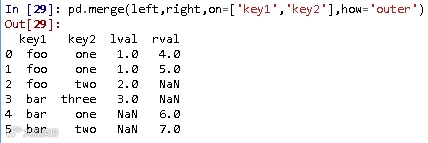 也可以根据多个键(列)进行合并,用on传入一个由列名组成的列表即可。