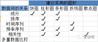 大部分数据间的关系可以归纳为以下六种类型:成分、排序、时间序列、频率分布、相关性、多重数据分布。