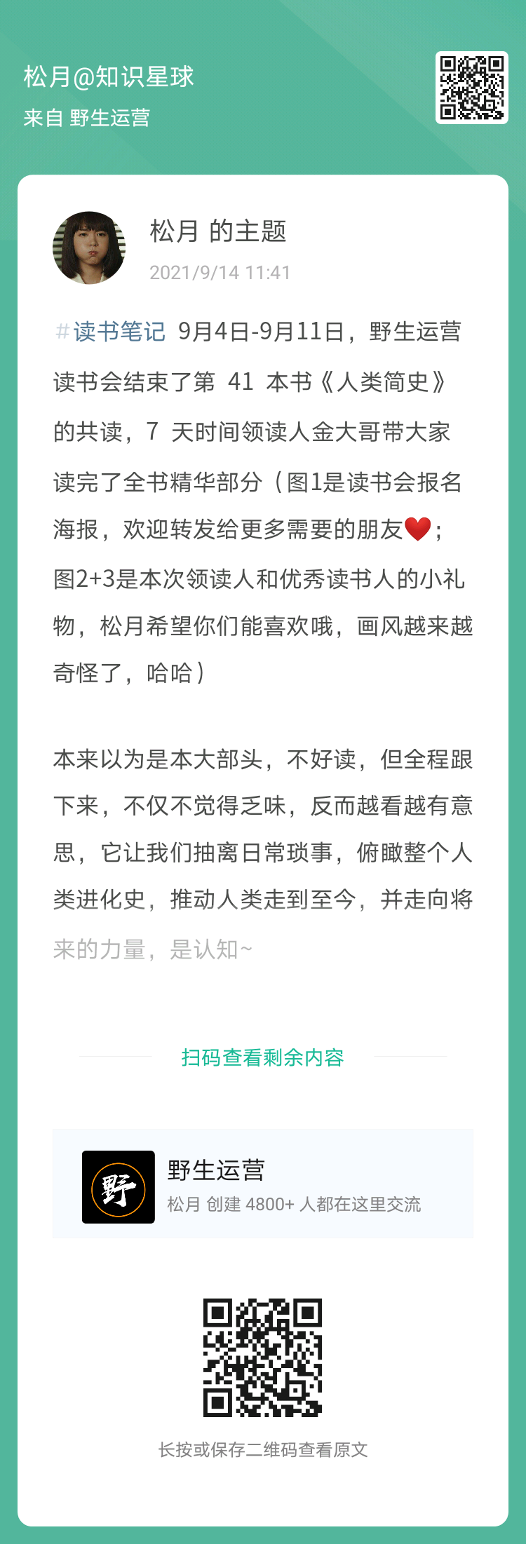 5、松月:野生运营读书会第 41 本书《人类简史》读书笔记(扫码看全文)