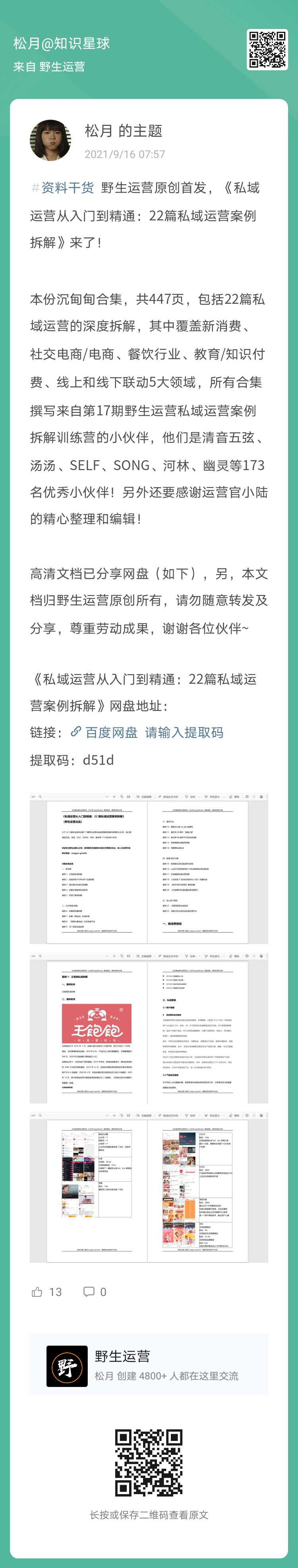 12、松月: 野生运营原创首发,《私域运营从入门到精通:22篇私域运营案例拆解》(扫码看全文)