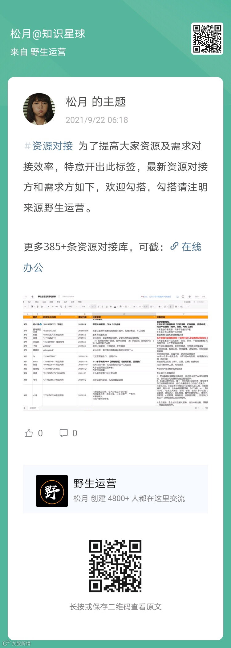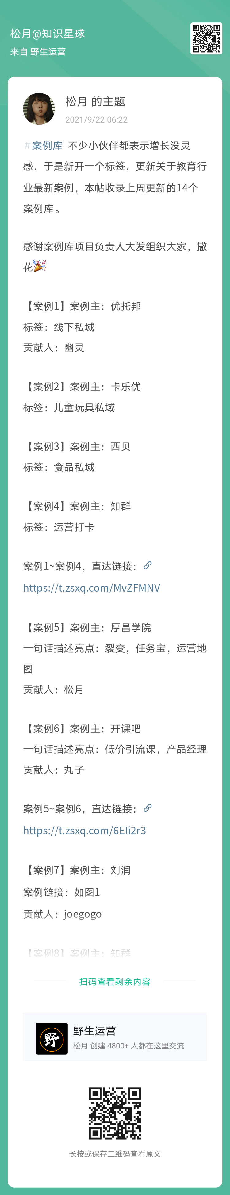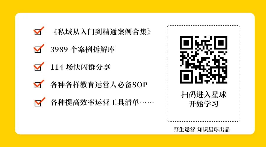 欢迎加入野生运营星球,每周一次快闪分享、运营人学习一手资料、1V1答疑……等硬核干货,而且还能一次入手包括 《2021上半年增长案例合集》、3989 个案例拆解全库、110+ 场群分享的音频+逐字稿、N多运营工具包和资料,就问你一句,值不值?