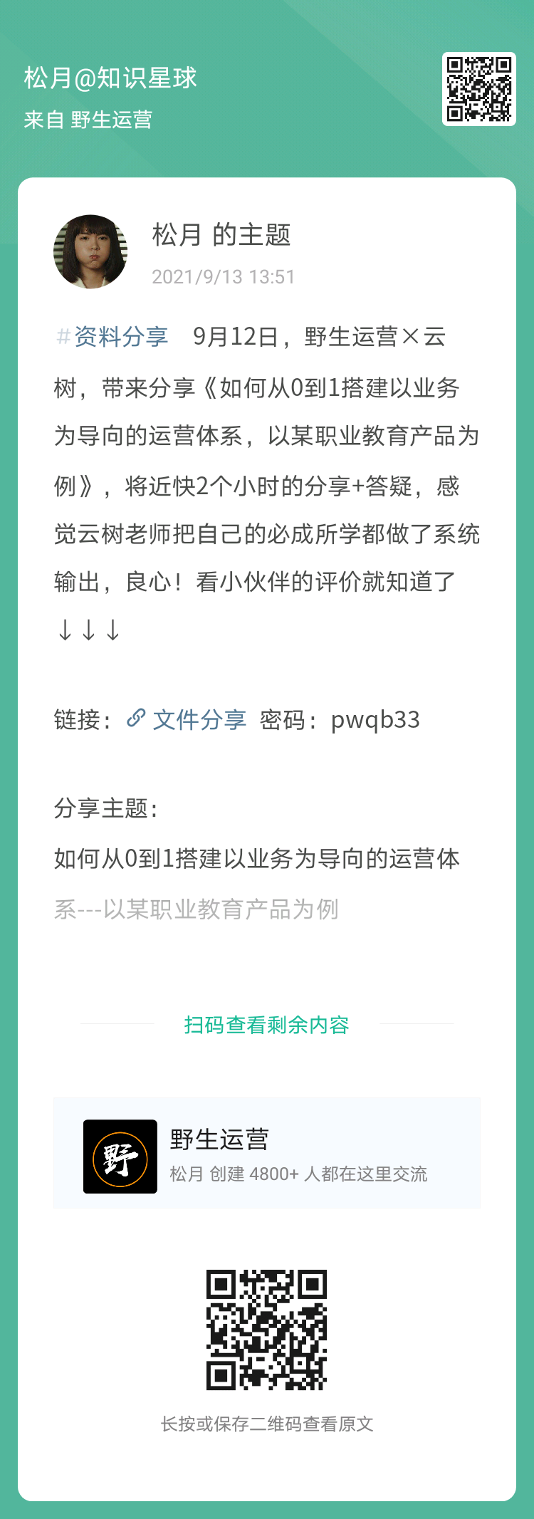 1、野生运营×云树,快闪分享《如何从0到1搭建以业务为导向的运营体系,以某职业教育产品为例》(扫码看全文)