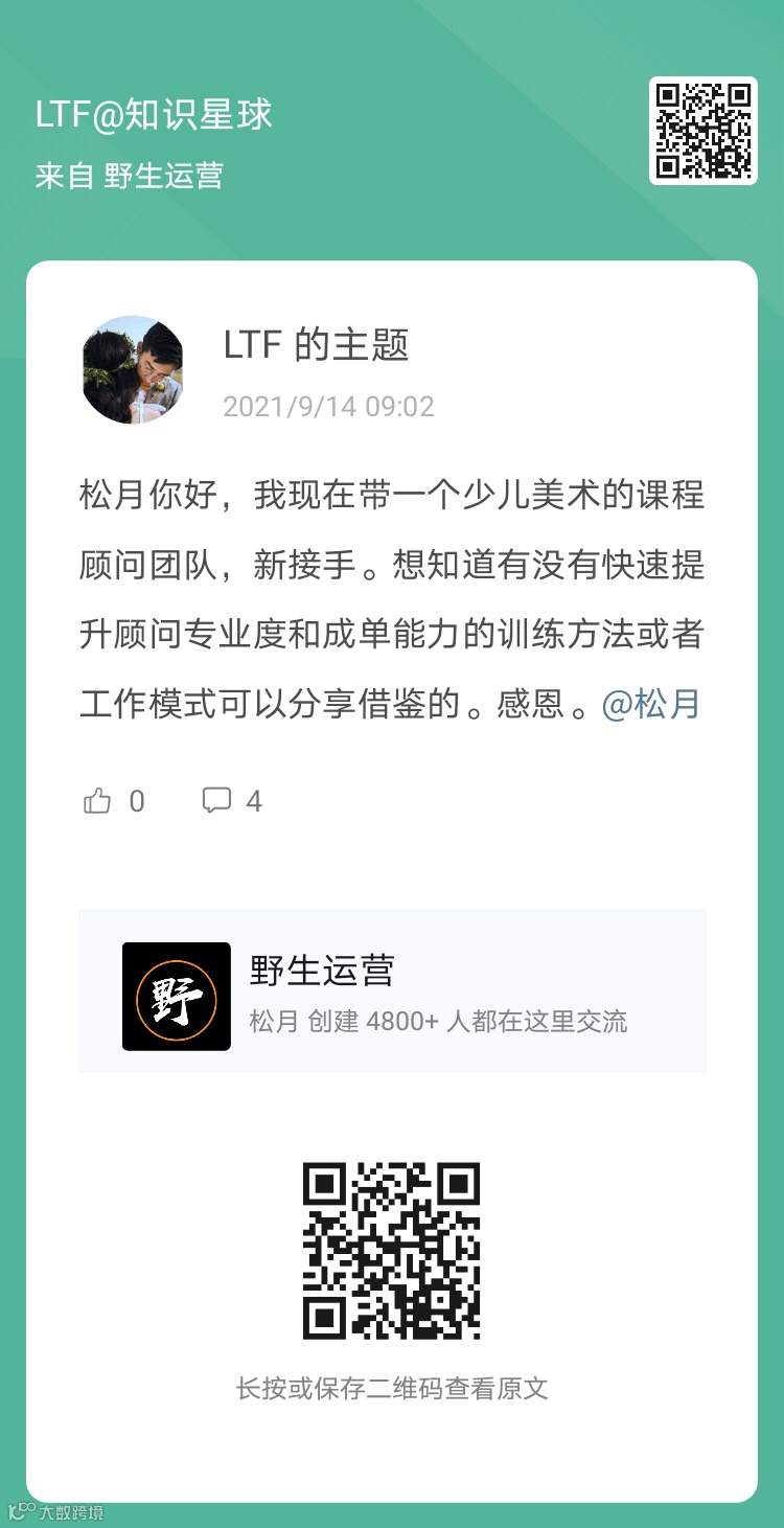 1、提问:想知道有没有快速提升顾问专业度和成单能力的训练方法或者工作模式可以分享借鉴?(扫码看全文)