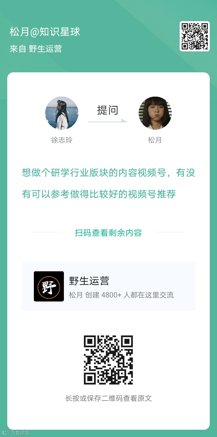 3、提问:想做个研学行业版块的内容视频号,有没有可以参考做得比较好的视频号推荐?(扫码看全文)