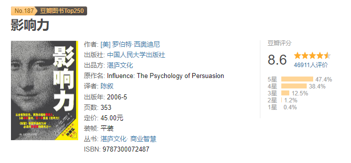 风靡全球35载,500万读者,百万好评,从未被超越的社会心理学经典作品,被读者评为最强大、最诡谲、最震慑人心的心理学书,被《财富》杂志鼎力推荐的75本商业必读书,单国内销量就过百万的畅销书——《影响力》
