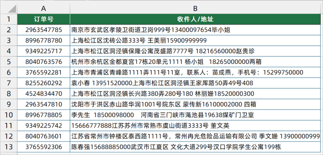 如下图所示,是某电商的订单信息表,B列是收件人/地址,其中的姓名、地址、手机号等信息顺序杂乱,部分收件人地址还没有省份信息。