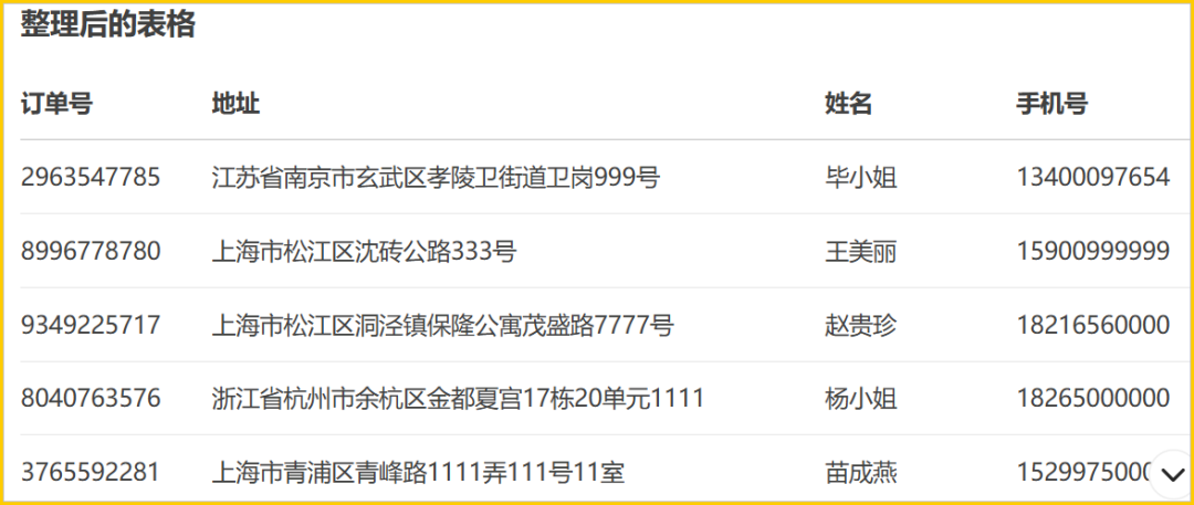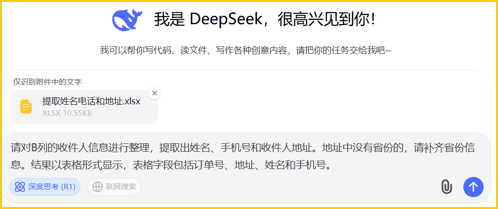 借助DeepSeek,能够从电商订单表中快速整理收件人的姓名、电话以及收件地址。