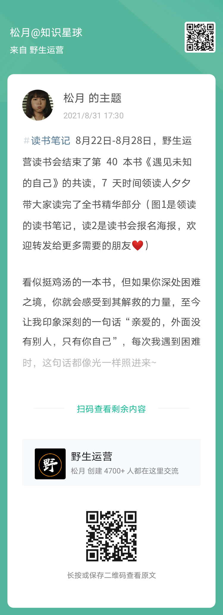 12、松月:野生运营读书会《遇见未知的自己》,读书笔记(扫码看全文)