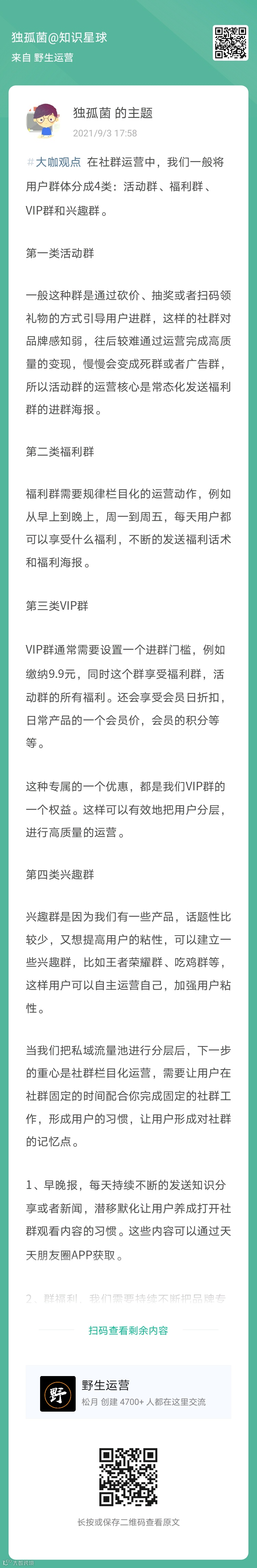 20、独孤菌:在社群运营中,我们一般将用户群体分成4类:活动群、福利群、VIP群和兴趣群(扫码看全文)