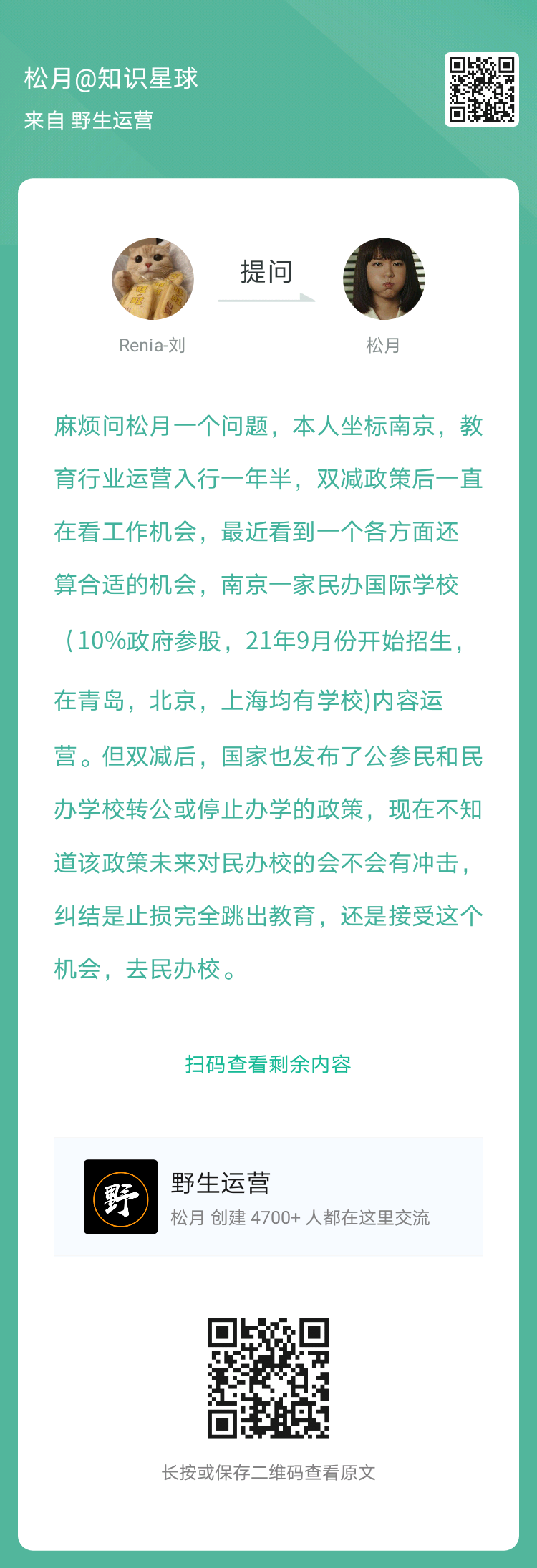 3、提问:刚刚进入教育行业,纠结是止损完全跳出教育,还是接受这个机会,去民办校?(扫码看全文)