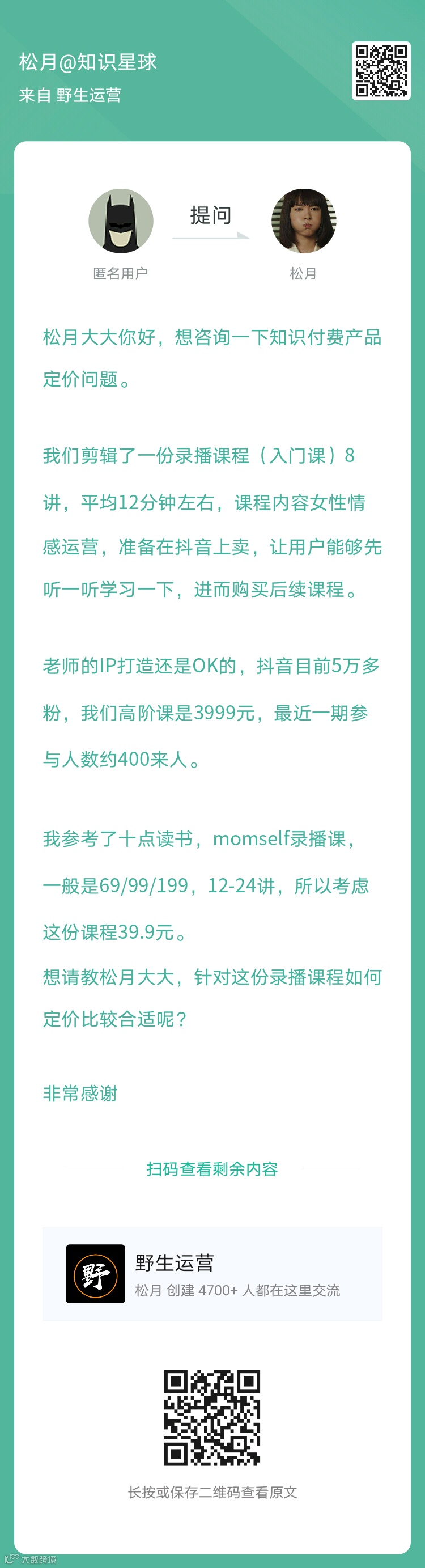 1、提问:录播课程如何定价比较合适呢?(扫码看全文)