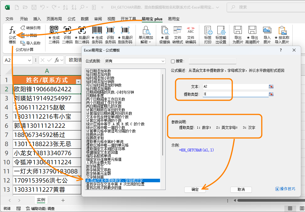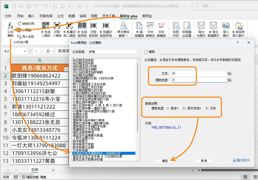单击Excel应用宝plus,公式模板,从混合文本中提取数字,字母或汉字,选择文本单元格,输入提取类型,输入三提取汉字,单击确定。
