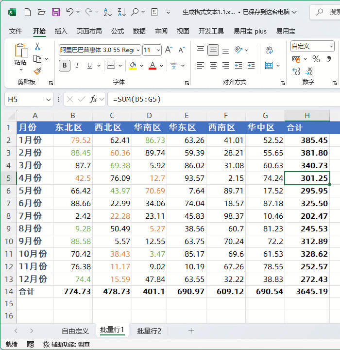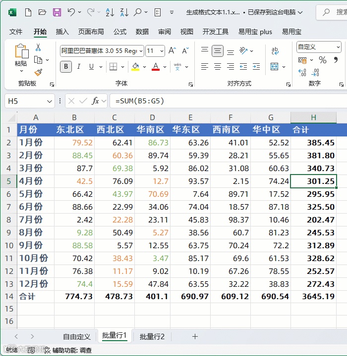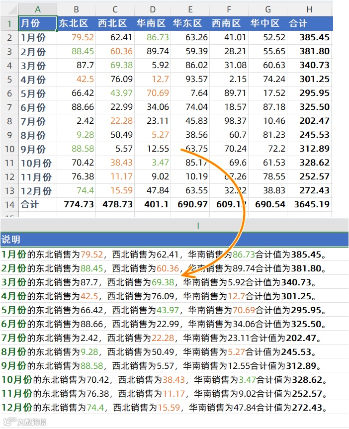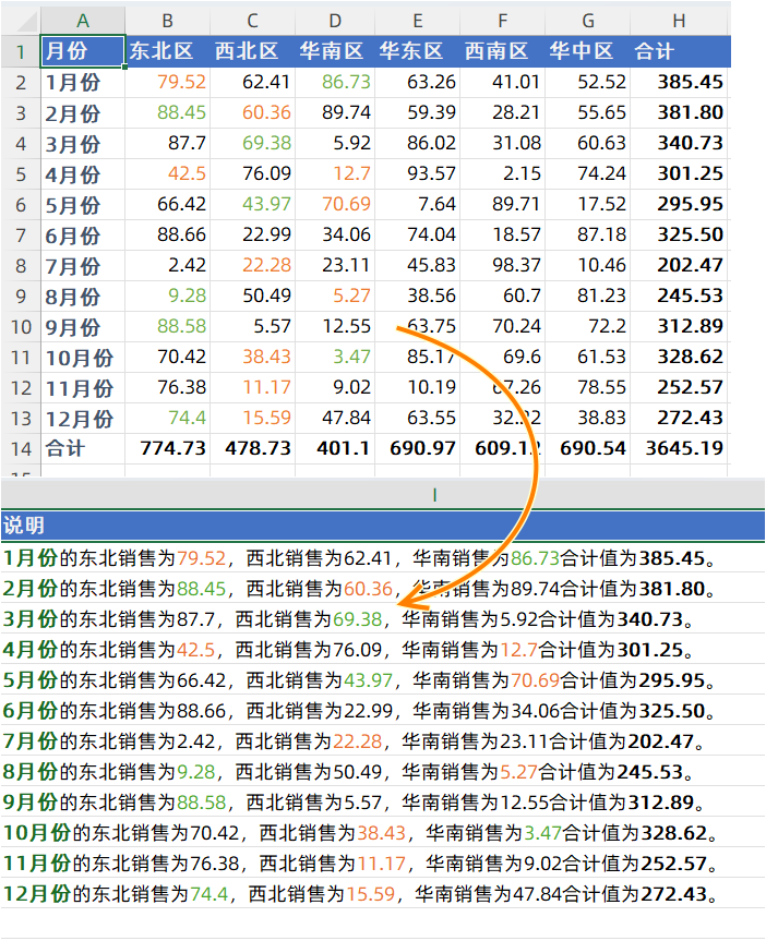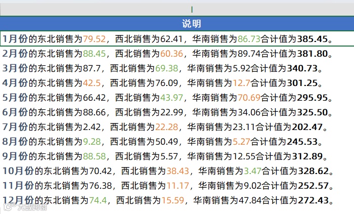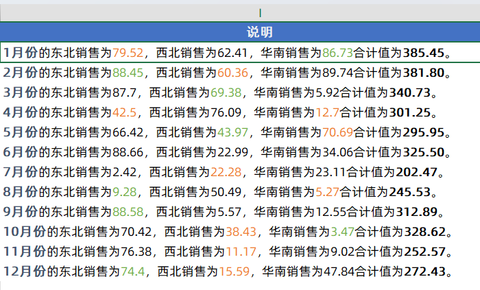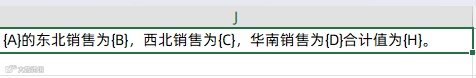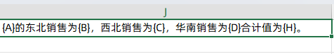 {A}的东北销售为{B},西北销售为{C},华南销售为{D}合计值为{H}。