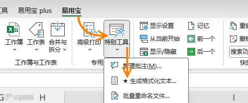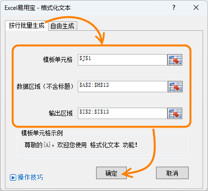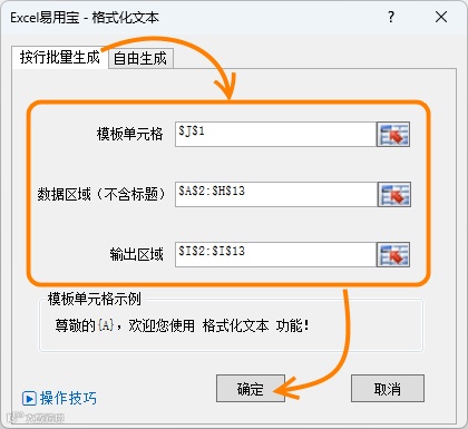 在弹出的格式化文本对话框中,选择按行批量生成,选择预设的模板单元格,选择数据区域,选择输出区域,单击确定。
