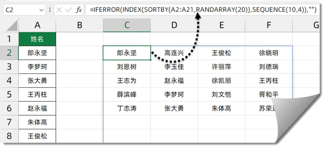 C2单元格输入以下公式,每按一次F9键,就可以得到四组随机排列的名单:=IFERROR(INDEX(SORTBY(A2:A21,RANDARRAY(20)),SEQUENCE(10,4)),"")
