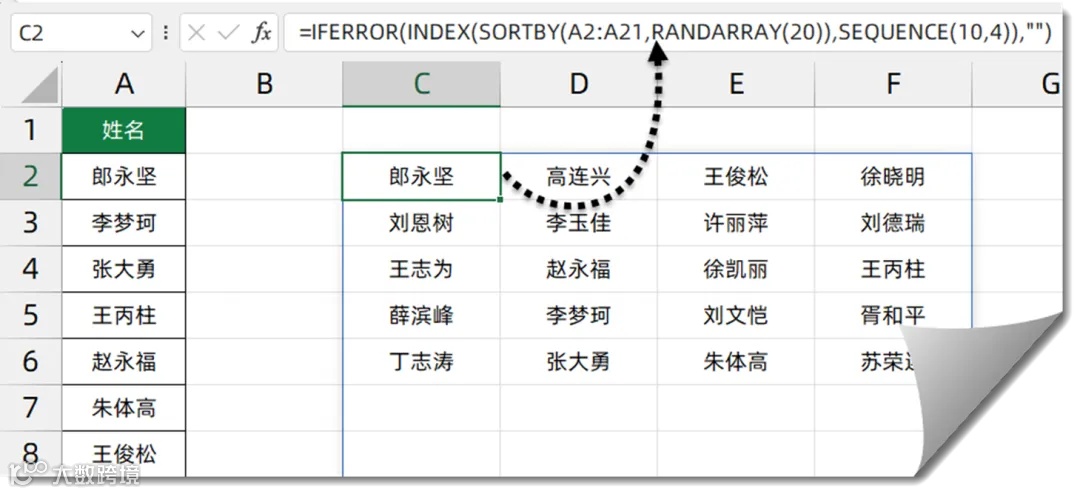 INDEX函数根据SEQUENCE生成的序列号,从随机排序后的姓名中返回对应位置的内容。