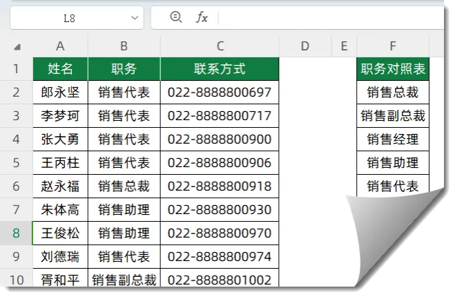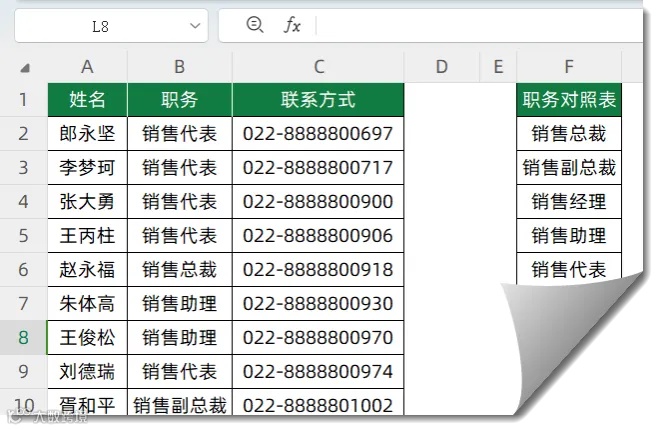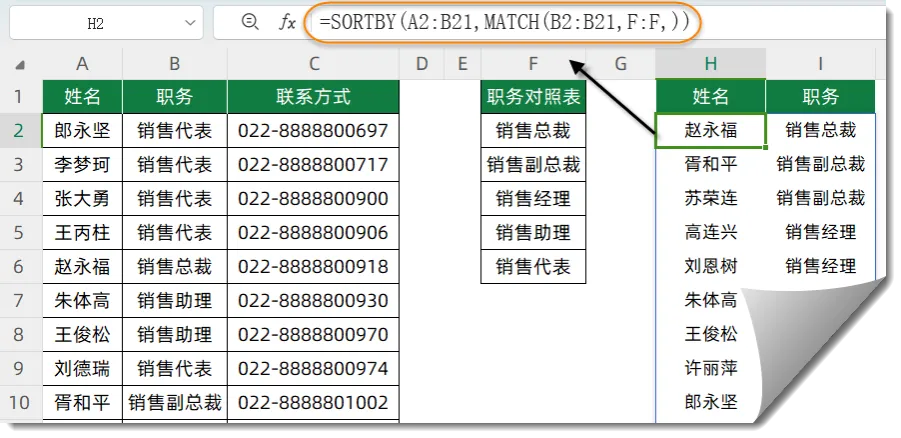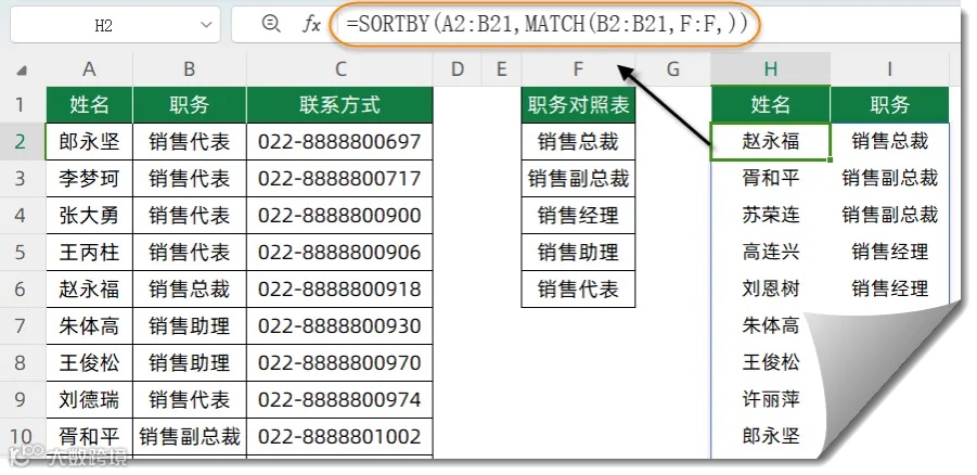 如下图,希望根据F列的职务对照表,对左侧的员工信息进行排序。