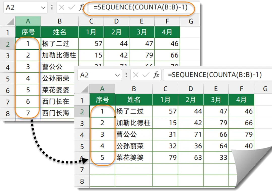 SEQUENCE函数用于生成指定行列的序列号。本例中,生成序号的行数由COUNTA(B:B)-1的结果来指定。也就是B列有多少行数据,SEQUENCE函数就生成对应行数的序号。