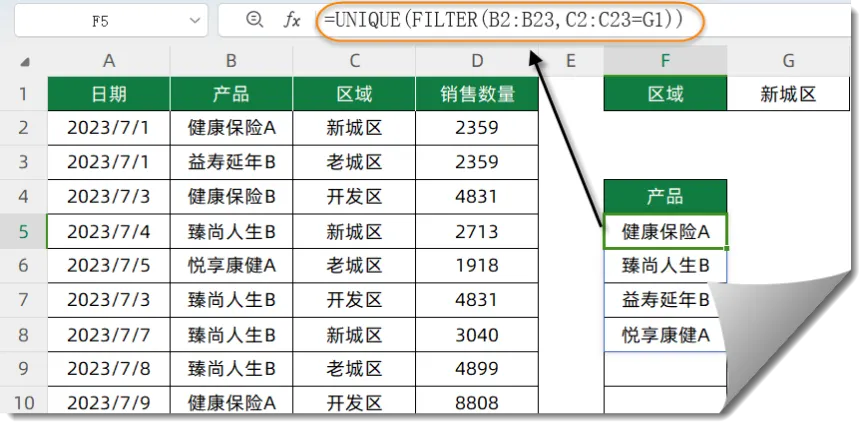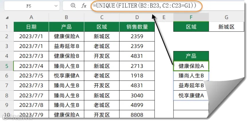 首先使用FILTER函数筛选出符合条件的全部产品列表,再使用UNIQUE函数去除重复项。